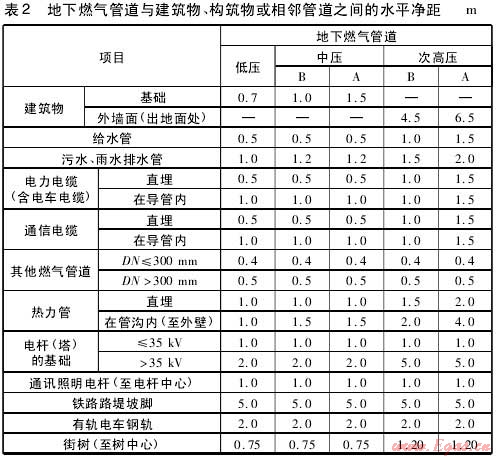 城鎮(zhèn)燃氣管道壓力分級及地下燃氣管道與建筑物、構(gòu)筑物或相鄰管道之間水平凈距分別見表1,表2。