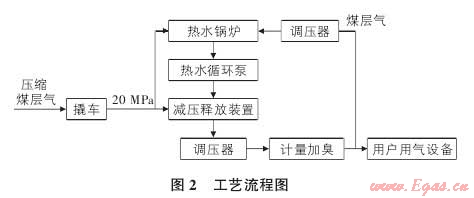 2) 熱水循環(huán)系統(tǒng)。熱水循環(huán)系統(tǒng)的主要設備是熱水鍋爐、熱水泵、電子水處理器、除污器等,負責向 CNG 減壓釋放裝置中的換熱設備提供循環(huán)熱水以保證系統(tǒng)的正常工作。調(diào)壓后的煤層氣作為熱水鍋爐的燃料。