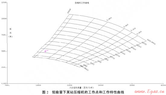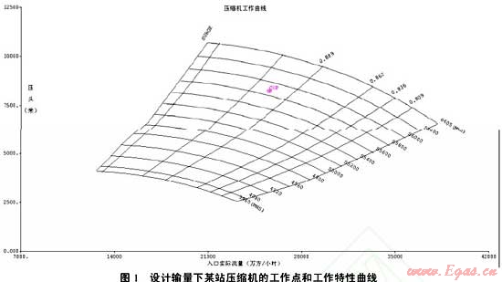 目前國(guó)內(nèi)已經(jīng)可以利用水力仿真軟件SPS模擬壓縮機(jī)工作曲線,完成壓縮機(jī)組的適用性分析。從不同輸量條件下某站壓縮機(jī)的工作點(diǎn)和工作特性曲線(圖2、圖3)明顯可見管道的水力工作點(diǎn)、壓縮機(jī)喘振曲線、堵塞曲線,最高轉(zhuǎn)速曲線、最低轉(zhuǎn)速曲線、效率曲線、不同轉(zhuǎn)速的揚(yáng)程曲線。