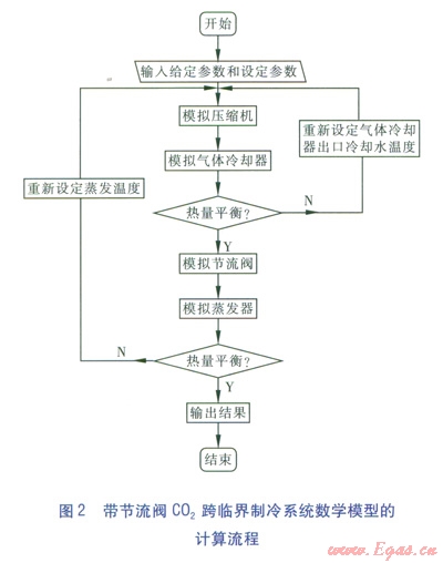 系統(tǒng)數(shù)學(xué)模型由各裝置數(shù)學(xué)模型通過適當(dāng)?shù)慕涌趨?shù)連接而成,即將每個(gè)裝置視為一個(gè)黑箱,通過輸入、輸出與其他裝置連接。帶節(jié)流閥CO2跨臨界制冷系統(tǒng)數(shù)學(xué)模型的計(jì)算流程見圖2。這里需要輸入氣體冷卻器和蒸發(fā)器的結(jié)構(gòu)參數(shù)、冷卻水和冷水的入口溫度和流量,設(shè)定蒸發(fā)溫度、氣體冷卻器出口冷卻水溫度,通過迭代計(jì)算,直到設(shè)定值與計(jì)算值的誤差在規(guī)定的范圍內(nèi)為止。最后輸出CO2跨臨界制冷系統(tǒng)的制冷性能系數(shù)、制冷量。