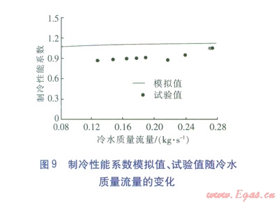 其他參數(shù)不變,制冷性能系數(shù)、制冷量模擬值、試驗(yàn)值隨冷水質(zhì)量流量的變化分別見圖9、10。由圖9、10可知,制冷性能系數(shù)、制冷量的模擬值均隨冷水質(zhì)量流量的增大而增加,但上升的趨勢相當(dāng)平緩,且試驗(yàn)值低于模擬值。