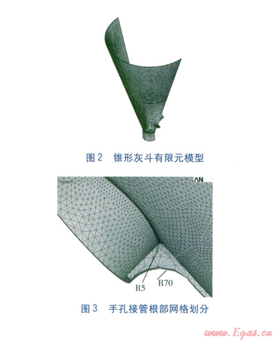 錐形灰斗有限元模型見圖2。將幾何模型共劃分成68 545個(gè)單元,l37 373個(gè)節(jié)點(diǎn)。手孔接管根部網(wǎng)格劃分見圖3,圖中數(shù)值單位為mm。