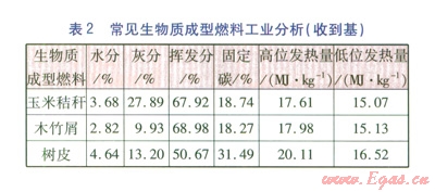 常見(jiàn)生物質(zhì)成型燃料工業(yè)分析(收到基)見(jiàn)表2。由表2可知,與煤相比,生物質(zhì)成型燃料具有以下特點(diǎn):水分較多,并與生物質(zhì)原料品種有關(guān),且差別較大。灰分較少,揮發(fā)分較高,固定碳含量較低,高位發(fā)熱量較低。