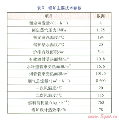 鍋爐外形尺寸(長(zhǎng)××)6.8 m×2.7 m×3.8 m,所燃用的生物質(zhì)成型燃料低位發(fā)熱量為16.4 MJkg。鍋爐主要技術(shù)參數(shù)見(jiàn)表3。在鍋爐蒸發(fā)量達(dá)到設(shè)計(jì)能力的工況下,經(jīng)權(quán)威部門(mén)測(cè)試,其熱效率達(dá)88%以上,排煙溫度為120135℃,達(dá)到設(shè)計(jì)要求。測(cè)試依據(jù)為TSG G0003-2010《工業(yè)鍋爐能效測(cè)試與評(píng)價(jià)規(guī)則》、TSG G0002-2010《鍋爐節(jié)能技術(shù)監(jiān)督管理規(guī)程》。