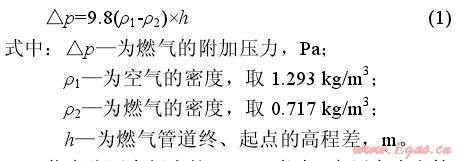 民用天然氣燃具的額定壓力pn=2000Pa,燃具前壓力應(yīng)在(0.75~1.5)pn范圍內(nèi)波動(參見《城鎮(zhèn)燃?xì)庠O(shè)計規(guī)范》(GB50028—2006))。當(dāng)天然氣壓力超出此范圍,燃具的熱效率降低,燃燒不穩(wěn)定,燃燒噪聲大,出現(xiàn)脫火或者回火等現(xiàn)象。目前,安陽市高層建筑的燃?xì)庠O(shè)計主要采用低壓入戶,在計算低壓燃?xì)夤艿赖膲毫p失時,應(yīng)考慮因建筑高度而引起的燃?xì)飧郊訅毫Α?/span>p,計算如下: