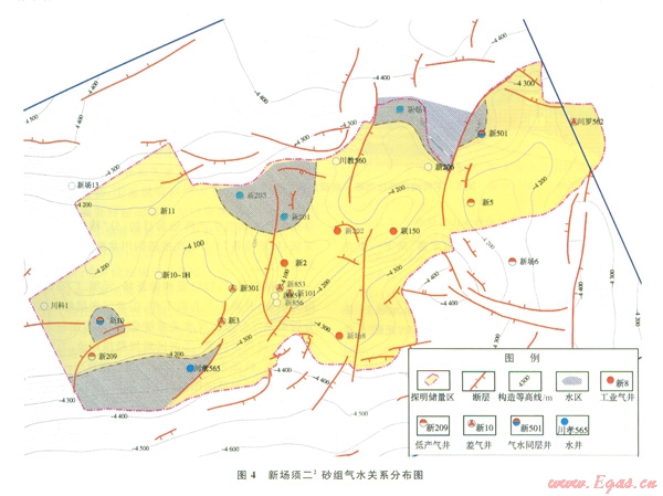 圖4顯示,新場(chǎng)氣田須二2砂組在氣藏較高部位還存在局部水區(qū),在南北均存在邊水且各井區(qū)氣水界面不同,這些現(xiàn)象充分說(shuō)明氣藏沒(méi)有統(tǒng)一的氣水關(guān)系。