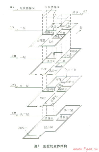 該建筑物共有21個主要功能房間(包含衛(wèi)生間、車庫、儲藏室等),兩個豎向氣流通道(樓梯間、中庭)。樓梯間是貫通負二層至屋頂?shù)娜诵型ǖ?。中庭從一層通至屋頂,類似于舊式建筑的天井,是與室外相通的空間。別墅的立體結(jié)構(gòu)見圖1,圖中各層標高的單位為m