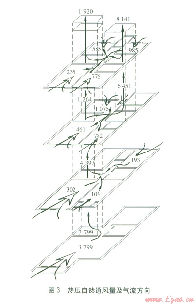 最終得到各支路的熱壓自然通風量、氣流方向(見圖3),圖3中各數(shù)值的單位為m3h。