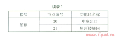 考慮到自然通風狀態(tài)下應(yīng)避免污染,因此不將衛(wèi)生間、廚房等存在污染源的房間列入熱壓自然通風網(wǎng)絡(luò)模型。熱壓自然通風網(wǎng)絡(luò)模型見圖2。熱壓自然通風網(wǎng)絡(luò)模型中各節(jié)點代表的功能區(qū)見表l。其中節(jié)點23設(shè)在通風井底面,節(jié)點20設(shè)在屋頂表面,其他節(jié)點均設(shè)在各層高度方向的中間位置。由此可知各節(jié)點的高度差。
