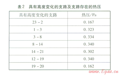 由圖2可知,共有7個支路具有高度變化(見表2),因此在這7個支路上存在熱壓,計算結(jié)果見表2。