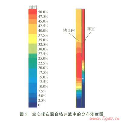 泵入的空心球與鉆井液混合流體中空心球的含量為40%,經(jīng)過分離后,大部分空心球由于密度的差異和環(huán)空流動的影響進(jìn)入環(huán)空,環(huán)空分離點(diǎn)以上空心球體積達(dá)到50%,分離點(diǎn)以下僅有少量的空心球(小于2%)未實(shí)現(xiàn)有效分離。如圖5所示,空心球在注入點(diǎn)以上環(huán)空內(nèi)分布均勻,能夠有效降低環(huán)空分離點(diǎn)以上鉆井液的密度,實(shí)現(xiàn)多梯度鉆井技術(shù)。