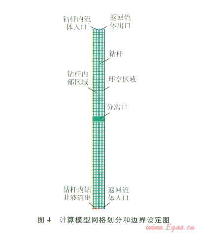 井下多相流分離的順利實(shí)施是多梯度鉆井技術(shù)實(shí)現(xiàn)的關(guān)鍵。采用FLUENT混合物(Mixture)模型[7-8]建立空心球注入模型,網(wǎng)格劃分及邊界條件如圖4所示。假設(shè)混合了空心球的鉆井液是不可壓縮流體,由于正常鉆進(jìn)時鉆井液的流量基本恒定,可假定鉆井液的流動是定常流動。在直角坐標(biāo)中混合流體的運(yùn)動控制方程[9]: