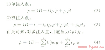 根據(jù)鉆井實(shí)際的需要可以設(shè)置一個或多個注入點(diǎn),這些注入點(diǎn)位置可以固定,也可以隨鉆柱移動而移動。井底壓力(p)為: