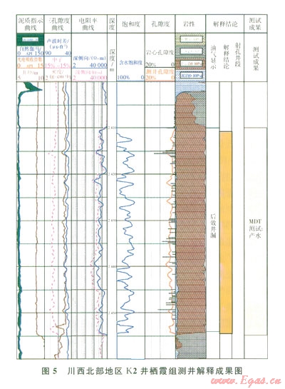 K2井位于川西北部的礦山梁構(gòu)造,該區(qū)地處四川盆地西北部的龍門山和米倉山交匯三角地帶,該區(qū)曾經(jīng)經(jīng)歷了多期次的構(gòu)造運動,地面斷層、油砂巖比比皆是。在地質(zhì)歷史時期,由于斷層的開啟、閉合不斷對平衡了的油氣藏進(jìn)行調(diào)整、改造及破壞。斷層的活動一方面提供了油氣調(diào)整的動力,另一方面也將地表的淡水帶入儲層,油氣運移出去后,水滯留在儲層內(nèi),從而導(dǎo)致儲層電阻率受地層水控制明顯。因此在斷層附近或者保存條件較差的地區(qū)進(jìn)行儲層流體解釋時,應(yīng)考慮地表水的滲入,避免因淡水滲入儲層形成高阻水層的氣層假象特征。