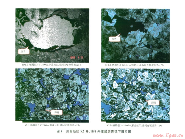 儲層瀝青的存在不僅改變了儲層孔隙結(jié)構(gòu),導(dǎo)致儲層巖電參數(shù)變化,而且還會導(dǎo)致物性、含油性和電性的變化。當(dāng)有瀝青充填到儲層的孔隙中時,由于瀝青的導(dǎo)電性差或不導(dǎo)電性將導(dǎo)致儲層電阻率較未含瀝青層段電阻率高,從而在測井曲線上表現(xiàn)出高電阻率的電性特征。HS1井和K2井在鏡下薄片中均可以見到瀝青不同程度的充填,其主要充填于儲集層的孔隙或裂縫中,從瀝青的產(chǎn)狀看,瀝青主要充填于晶間和晶間溶蝕溶孔的內(nèi)壁(4)。從測井曲線看,當(dāng)瀝青出現(xiàn)在有瀝青充填的儲層井段時,該段電阻率值明顯較同一巖性井段的要高。