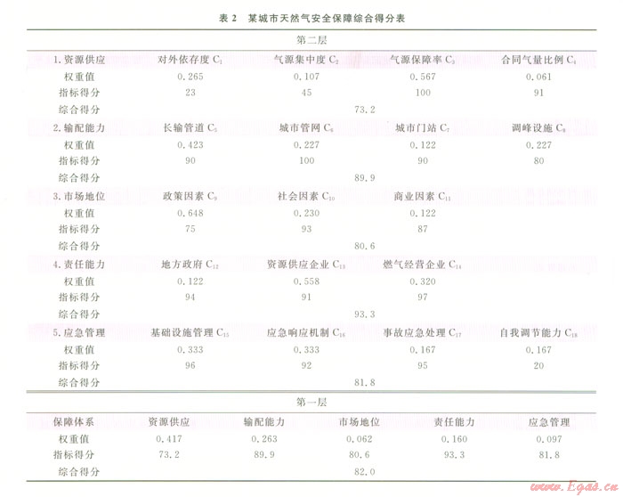 本文從天然氣產(chǎn)、運、銷物流系統(tǒng)整體出發(fā),同時納入“政府、企業(yè)、用戶”三方責(zé)任承擔(dān)與應(yīng)急管理評價指標(biāo),形成一套城市供氣安全的綜合保障評價體系。同時采用成熟的層次分析法建立數(shù)學(xué)模型,分別計算指標(biāo)權(quán)重與模型得分,定性分析和定量計算相結(jié)合,對城市的供氣保障形成直觀認(rèn)識。計算實例表明,模型在分析影響城市供氣安全不利因素、提高認(rèn)識的準(zhǔn)確水平,以進(jìn)一步增強(qiáng)城市供氣保障措施和安全系數(shù),具有一定的輔助分析作用。