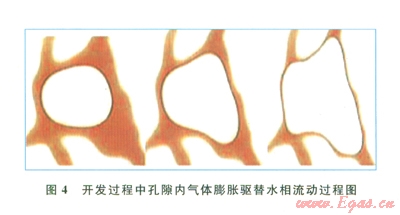 氣藏開發(fā)過程中,隨著儲層壓力逐步下降,壓力降傳導(dǎo)到孔隙內(nèi)的氣體時,氣體體積迅速膨脹,對孔隙表面水相進行擠壓,并對微細(xì)孔喉處的水相產(chǎn)生推動力,這種推動力只要大于某一微細(xì)孔喉處的毛細(xì)管力束縛,則這部分微細(xì)孔喉處及其控制的孔隙內(nèi)的殘余水就會被推動,從而運移產(chǎn)出成為可動水(圖4)。另一方面,開發(fā)過程遠(yuǎn)遠(yuǎn)快于成藏過程,因而開發(fā)過程中驅(qū)替壓力梯度大于成藏過程中的驅(qū)替壓力梯度,故成藏過程中部分末被驅(qū)出的水相可以在開發(fā)過程被驅(qū)替出,成為可動水。對于須家河組氣藏而言,由于微細(xì)孔喉發(fā)育,殘余水飽和度較高,衰竭式開發(fā)過程中壓力梯度大,因而可動水產(chǎn)出量較大,嚴(yán)重影響氣藏產(chǎn)能。
