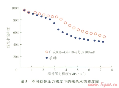 對須家河組2塊低滲透巖樣進行了不同壓力梯度下氣驅(qū)飽和水巖樣實驗,在初始高含水飽和度階段,隨著驅(qū)替壓力梯度的增大,殘余水飽和度降低緩慢,主要是由于氣相飽和度小于20%,不能產(chǎn)生連續(xù)氣相運移。隨著驅(qū)替壓力梯度的進一步增大,氣相飽和度逐步增加,達(dá)到臨界含氣飽和度20%后,形成連續(xù)運移,這時氣相運移進入大喉道及其控制的孔隙中,使得含水飽和度快速降低。當(dāng)含水飽和度降低到50%后,氣相進入更細(xì)小的喉道及孔隙的難度加大,驅(qū)替壓力梯度的增加導(dǎo)致含水飽和度緩慢降低(圖5)。須家河組低滲透砂巖氣藏儲層含水飽和度在40%~60%之間,高于束縛水飽和度,存在0~20%的可動水飽和度。驅(qū)替壓力梯度越大,水相越容易動用。