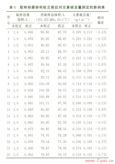 為了保證取樣時(shí)取樣容器中不含影響測(cè)定準(zhǔn)確性的水和氧氣等干擾物,在取樣前對(duì)容器進(jìn)行干燥和無(wú)氧化處理是非常重要的。同時(shí)由于計(jì)算元素硫含量時(shí),需要掌握樣品在標(biāo)準(zhǔn)參比條件(我國(guó)為101.325kPa,20.0℃)下的體積。而天然氣樣品是采集在壓力下的取樣容器中的,當(dāng)已知取樣容器的容積、樣品的壓力和氣體在壓力下的壓縮岡子,根據(jù)氣體狀態(tài)方程,可計(jì)算天然氣樣品在標(biāo)準(zhǔn)參比條件下的體積。因此,如何準(zhǔn)確測(cè)定取樣容器的容積是實(shí)施測(cè)定前必須考慮的關(guān)鍵因素之一。表l為取樣容器進(jìn)行容積校正前后對(duì)元素硫測(cè)定結(jié)果的影響程度??梢钥闯觯尤萜魑葱U亓蚝恐当刃U亓蚝恐档?span lang="EN-US">2%~5%。