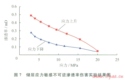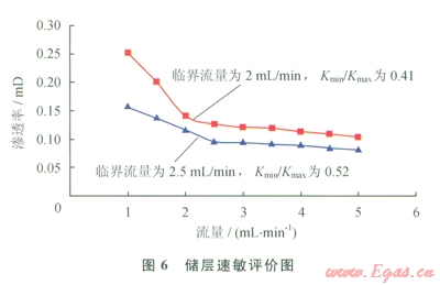 2)中等速敏和壓力敏感損害:儲層巖心液測速敏實驗表明,在1~5mL/min的測定流量范圍內(nèi),巖心的最小滲透率Kmin和最大滲透率Kmax分別為0.1029mD、0.2514mD和0.08mD、0.155mD,臨界流量為2~2.5mL/min,Kmin/Kmax分別為0.41、0.52,液測速敏損害較強(圖6)。儲層巖心應(yīng)力敏感實驗結(jié)果由實驗結(jié)果可知:該地區(qū)低滲透儲層的應(yīng)力敏感性為中等損害,滲透率由0.49mD降低為應(yīng)力變化后的0.275mD,其應(yīng)力敏感引起的不可逆滲透率損害率為43.9%(圖7)。