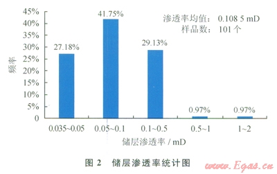 根據(jù)砂巖儲層孔隙度、滲透率與最大孔喉半徑的關(guān)系,該區(qū)塊儲層滲透率主要分布在0.035~0.5mD,占98.06%,主要孔喉半徑分布在O.1~0.8mm;儲層最大滲透率范圍在0.5~2mD,其對應(yīng)的最大孔喉半徑范圍0.8~3.0mm,該儲層對滲透率貢獻率最大的孔喉半徑區(qū)間為0.1~0.8mm和0.8~3.0mm。