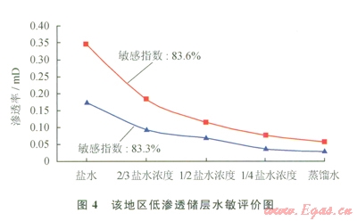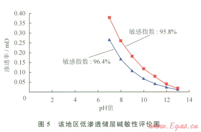 1)儲層巖心具有較強的水鎖、水敏和堿敏損害特征:根據(jù)對該地區(qū)低滲透儲層段含水飽和度的統(tǒng)計,其儲層段含水飽和度平均為64.81%,對照實驗結(jié)果,儲層段受到中等偏強水鎖損害(表1)。儲層段巖心水敏性實驗表明,滲透率分別由0.3485mD降至0.0572mD、由0.1750mD降至0.0292mD,巖心的敏感指數(shù)分別為83.6%和83.3%,說明該地區(qū)低滲透儲層段具有強水敏性(圖4)。儲層段巖心堿敏評價實驗結(jié)果表明,當pH值由7升至l3時,巖心滲透率分別南0.3762mD降至0.0158mD、由0.2639mD降至0.0095mD,巖心的堿敏感指數(shù)分別為95.8%和96.4%,該地區(qū)低滲透儲層具有強的堿敏性(圖5)。