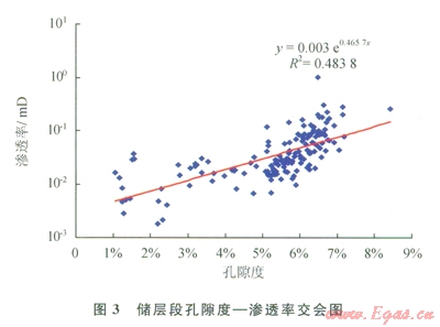 通過對該地區(qū)儲層段巖樣統(tǒng)計分析表明,儲層孔隙度主要集中分布在6%~8%(圖1),平均孔隙度為6.72%;儲層段樣品滲透率主要集中在0.035~0.5mD,占98.06%(圖2),平均滲透率為0.1085mD。儲層孔隙度和滲透率二者存在較好的指數(shù)相關(guān)性,R達到0.6988,滲透率隨孔隙度增大而增大(圖3)。因此,該區(qū)儲層屬于低孔、低滲透性儲層。