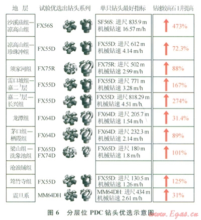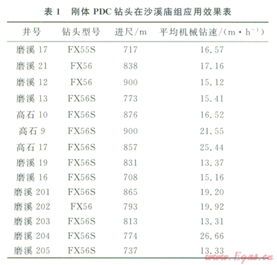 通過試驗與優(yōu)化改進PDC鉆頭,逐步優(yōu)選出適應(yīng)各層位的PDC鉆頭型號(6),機械鉆速和單只鉆頭進尺大幅度提高,第二批正鉆井在沙溪廟地層試驗剛體PDC鉆頭取得新進展,平均機械鉆速由傳統(tǒng)胎體PDC鉆頭7.24mh提高到16.27mh(1),已接近空氣鉆進效果。