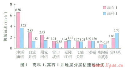 海相地層占全井進尺的57(3000m),巖石強度高,硅質(zhì)含量重,部分層段含燧石結(jié)核和角礫云巖,機械鉆速極低,高科1井、高石l井各地層平均機械鉆速統(tǒng)計如圖1所示,不能采用氣體鉆提速的陸相碎屑巖地層的平均機械鉆速小于2.50mh,嚴(yán)重影響了全井鉆井速度。