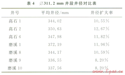 有機鹽鉆井液體系在高石2井、高石6井、磨溪8井、磨溪9井、磨溪l0井的Æ311.2mm井段和Æ215.9mm井段現(xiàn)場應(yīng)用。表4為高石2、高石6、磨溪8、磨溪9、磨溪l0Æ311.2mm井段應(yīng)用有機鹽鉆井液的平均井徑對比數(shù)據(jù),轉(zhuǎn)換為有機鹽體系后的滾動回收率均提高,機械鉆速明顯提高,平均井徑擴大率明顯降低(4),高石2井等井由于上部氣體鉆形成的大井徑,造成井徑擴大率偏高。
