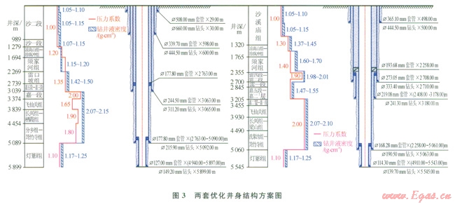 針對部分區(qū)塊雷口坡組存在異常高壓的情況優(yōu)化設(shè)計了非常規(guī)井身結(jié)構(gòu)[1]。圖3為標(biāo)準(zhǔn)尺寸與非常規(guī)尺寸優(yōu)化井身結(jié)構(gòu)示意圖。