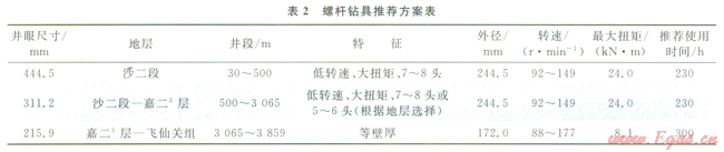 鉆井提速技術(shù)已經(jīng)廣泛應(yīng)用PDC鉆頭+螺桿鉆具的復(fù)合鉆井模式[2],螺桿的使用增加了井底鉆頭轉(zhuǎn)速從而大幅提高鉆井速度。但常規(guī)螺桿鉆具在大尺寸井段的扭矩不足,隨著井底溫度升高也會對螺桿定子橡膠產(chǎn)生影響[5-6],通過對不同井眼尺寸的螺桿鉆具應(yīng)用試驗效果進行分析,推薦了螺桿鉆具應(yīng)用的參數(shù)要求(2),從而更好地與PDC鉆頭使用時間匹配: