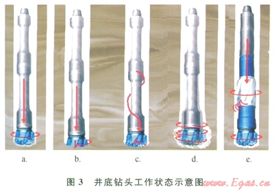 TorkBuster(阿特拉公司)將鉆井液的流體能量轉(zhuǎn)換成高頻(6802400次/rain)、均勻穩(wěn)定的扭向機械沖擊能量并直接傳遞給PDC鉆頭實現(xiàn)瞬時破巖,此時PDC鉆頭上就有兩個力在切削地層,一個是轉(zhuǎn)盤提供的扭力,一個是TorkBuster提供的扭向沖擊力,相當(dāng)于每分鐘額外6802400次切削地層,使鉆頭不需要等待積蓄足夠的能量就可以切削地層,消除了“卡—滑”現(xiàn)象,保持鉆頭對地層切削的連續(xù)性(3-e),因此能夠大幅提高機械鉆速,延長鉆柱壽命,提高鉆井效率。