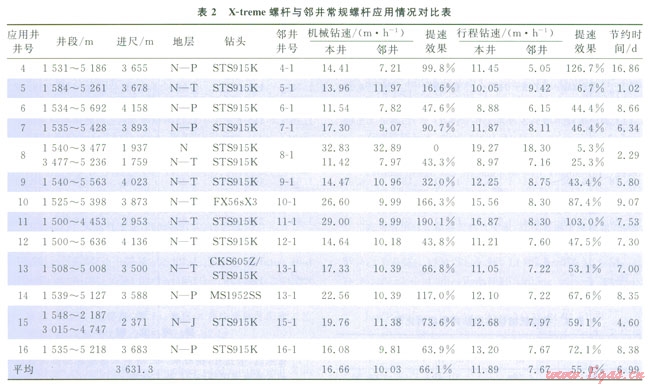 X-treme螺桿(Æ203mm)+PDC鉆頭復(fù)合鉆井技術(shù)在塔北地區(qū)哈拉哈塘、新墾、熱普區(qū)塊13口井第二次開鉆的Æ241.3mm井眼上部井段進行了應(yīng)用,應(yīng)用地層為新近系—三疊系、部分井進入二疊系頂部,平均單井進尺3631.3m,平均機械鉆速和行程鉆速分別為l6.66mh11.89mh,表2X-treme螺桿(Æ203mm)與鄰井常規(guī)螺桿應(yīng)用情況對比。