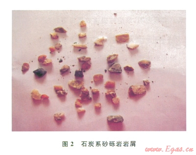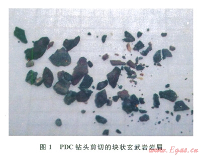 2)二疊系:巖性復(fù)雜,主要為玄武巖、砂巖和泥巖互層。地層硬度大,達l581.26MPa,可鉆性差,三牙輪可鉆性級值達7.65PDC鉆頭可鉆性級值達6.1;玄武巖致密、性脆、硬度極高,耐磨性強,對鉆頭傷害極大,導(dǎo)致跳鉆現(xiàn)象,崩壞PDC鉆頭切削齒;PDC鉆頭失效造成多余的起下鉆,而換成牙輪鉆頭后機械鉆速極低,多分布于12mh,低至1mh,導(dǎo)致鉆井周期增大,為該地區(qū)鉆井難度最大的地層。圖l為塊狀玄武巖屑照片。