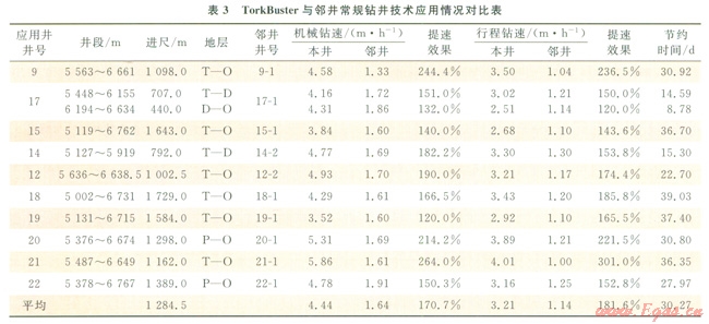 第二階段對鉆頭進行優(yōu)化,配合針對塔北地區(qū)設(shè)計的PDC鉆頭U513M10口井第二次開鉆的Æ241.3mm下部井段進行了應(yīng)用,應(yīng)用地層為三疊系—奧陶系,平均單井進尺1284.5m,平均機械鉆速和行程鉆速分別為4.44mh3.2lmh,與鄰井同井段應(yīng)用常規(guī)鉆井技術(shù)相比,分別提高170.7%和181.6%;表3TorkBuster與鄰井常規(guī)鉆井技術(shù)應(yīng)用情況對比,TorkBuster+U513M技術(shù)提速效果顯著。
