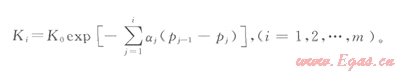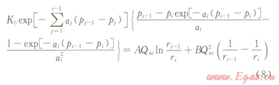 在Pi≤P≤i-1內(nèi)(其對應(yīng)的徑向距離ri≤r≤ri-1),儲層滲透率可以表示為: