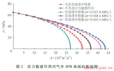 圖2為應(yīng)力敏感作用對氣井IPR曲線的影響,從圖中可以看到,應(yīng)力敏感作用會使氣井的產(chǎn)量降低,特別是在井底流壓較低時,產(chǎn)量降低得越嚴重;對于滲透率模量計算的IPR曲線,在相同的井底流壓下,常滲透率模量越大,氣井的產(chǎn)量越低;對于該氣井用變滲透率模量計算的IPR曲線與用常滲透率模量計算的IPR曲線在形態(tài)上具有相似性,但是當(dāng)井底流壓較小時,用變滲透率模量計算的產(chǎn)量與用常滲透率模量計算的產(chǎn)量差異較大,由于變滲透率模量更能夠反映儲層的滲流特征,因此用傳統(tǒng)的常滲透率模量計算的產(chǎn)量可能會錯誤估計應(yīng)力敏感作用對氣井產(chǎn)量的影響。