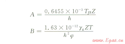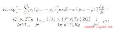 P0為原始地層壓力,MPa;p為目前地層壓力,MPa;K0為原始滲透率,mD;K為目前滲透率,mD;a為滲透率模量,Mpa-1;r為平面徑向距離,m;m為黏度,mPa·s;u為氣體在地層中的滲流速度,m/s;b為湍流系數(shù),m-1;r為地層氣體密度,kg/m3;Qsc為地面標(biāo)準狀態(tài)下的產(chǎn)量,m3/d;psc為標(biāo)準大氣壓,Mpa;Z為氣體偏差,無因次;T為地層溫度,K;h為儲層百度,m;Tsc為標(biāo)準狀態(tài)下溫度,K;gg為地層氣體的相對密度,無因次;R為通用氣體常數(shù),Mpa·m3/(kmol·K);j為孔隙度,無因次。