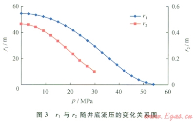 圖3為r1與r2隨井底流壓的變化關(guān)系圖,由于實驗發(fā)現(xiàn)在有效應(yīng)力的變化范圍內(nèi)存在著3段滲透率模量,因此從井眼半徑r3(或rw)到供給半徑r0(或re)之間存在著r2與r1將氣藏在徑向上分為3個區(qū)域,每個區(qū)域由于有效應(yīng)力的不同而呈現(xiàn)出不同的滲透率變化規(guī)律,從圖中看到,當(dāng)井底流壓小于30MPa時,r1與r2隨著井底流壓的增大都會減小,當(dāng)井底流壓大于30MPa且小于56MPa時,由于地層中有效應(yīng)力減小,在徑向上則只存在兩個區(qū)域,且分界處r1隨著井底流壓的增大會進一步減小,直到當(dāng)井底流壓大于56MPa時,則退化為了常滲透率模量的產(chǎn)能模型。