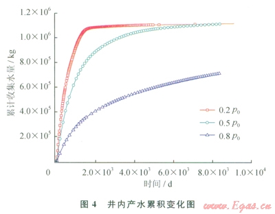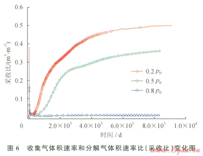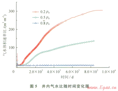 從上述研究成果町以得出,在0.2p0條件下,水合物藏中水合物全部分解,井內(nèi)收集到3.4×105m3的氣體。圖40.2p042℃,0.5p042℃,0.8p042℃3種條件下,井內(nèi)收集水的累積變化圖。從圖4中可以看出,產(chǎn)水集中在開采前期1500d,后期產(chǎn)水速率小。在0.5p0、42℃,0.8p042℃條件下,也有較大量的水被收集,表明也有較大量的水合物被分解了。圖5為整個開采過程中3種條件下,井內(nèi)氣水比隨時間的變化圖。從圖5可以看出,0.2p0、42℃條件下,氣水比一直在增加,最大值達(dá)到304;而0.5p042℃條件下,氣水比增加緩慢,最大達(dá)到136;0.8p0、42℃條件下氣水體積比一直接近0,開采后期也沒有改善??梢钥闯?,在井內(nèi)壓力高時,井和物藏間的壓差不夠大,整個開采過程,分解后的自由氣并沒有大量流人開采井內(nèi)。可見減壓驅(qū)動力對于分解后自由氣在井內(nèi)的收集非常重要。物藏和井之間壓差太小,自由氣一直留在物藏內(nèi),無法在井內(nèi)被收集。