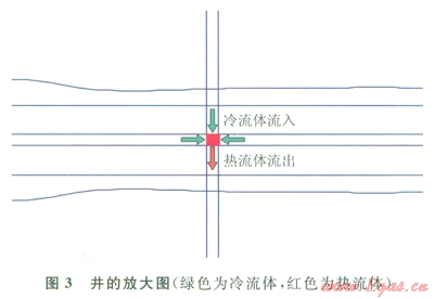 式中A1表示導(dǎo)熱面積0.4m2(井左右網(wǎng)格對井導(dǎo)熱距離大,其導(dǎo)熱熱流忽略);l表示導(dǎo)熱系數(shù),其中lrock表示地層骨架(沙石)導(dǎo)熱系數(shù),3.1W(m·K),占0.6的空間,有效導(dǎo)熱系數(shù)為1.86W(m·K),lrock表示水的導(dǎo)熱系數(shù)0.58W(m·K),孔隙度為0.4,飽和度為0.5,有效導(dǎo)熱系數(shù)為0.12W(m·K)DT表示井和其周圍網(wǎng)格間溫差,來自模擬結(jié)果文件;L表示導(dǎo)熱距離0.35m,井中心到上下網(wǎng)格中心距離。