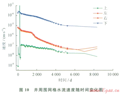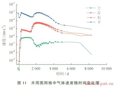 孔隙滲透換熱能夠?qū)⒛芰總魅宋锊?。圖l0為井周圍網(wǎng)格水流速度隨時間的變化圖。左、右和下表示網(wǎng)格中水流向井內(nèi),而上則表示井從上流入其正下方網(wǎng)格。圖10中下表示正上方網(wǎng)格流人下方井內(nèi)水流速率,也就是圖10表示的曲線,該速率遠(yuǎn)高于其他3個方向的速率。圖ll為井周圍網(wǎng)格中氣體速率隨時間變化圖。同樣是上方網(wǎng)格流向正下方井內(nèi)氣體速率最大,也就是圖ll表示的曲線。氣流和水流的速率數(shù)量級均為l04ms。由于甲烷氣導(dǎo)熱系數(shù)約為0.03W(m·K),遠(yuǎn)低于液態(tài)水的導(dǎo)熱系數(shù),其換熱可以不計(jì)算,這里只計(jì)算水的對流。