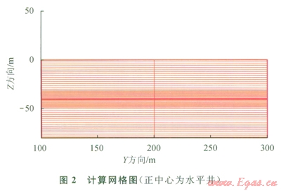 Z軸方向(豎直方向),水合物層細(xì)分為Dz=0.2-1m的網(wǎng)格。而上下層在Z方向上,單個網(wǎng)格lm2m,Z方向共離散成55個間隔。在Y方向(寬度方向)400m被分為3個網(wǎng)格,兩側(cè)網(wǎng)格均為l99.9m,中間網(wǎng)格為0.2m,用做開采井。X方向?yàn)?span lang="EN-US">1m單個網(wǎng)格??偩W(wǎng)格數(shù)為l65(55×3)。最頂層和最底層的6(3×2)個網(wǎng)格作為邊界網(wǎng)格(恒溫、恒壓),離散所得的網(wǎng)格如圖2所示。開采井在網(wǎng)格正中心,圖3為井的放大圖,圖3中示意了流體流向。井內(nèi)溫度壓力條件根據(jù)模擬需要進(jìn)行相應(yīng)設(shè)置。井溫度設(shè)定為42(恒溫),壓力設(shè)置為0.2P0、0.5P0、0.8P0 (恒壓)3個級別進(jìn)行模擬開采。