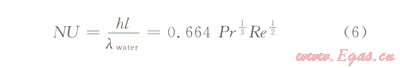 式中NU表示努賽爾數(shù);h表示換熱系數(shù);l表示特征長度0.33m,4倍面積除以潤周得到特征長度;lwater表示水的有效導(dǎo)熱系數(shù),0.12W(m·K);Pr表示普朗特?cái)?shù),取飽和水40℃時的值;Re表示雷洛數(shù)。