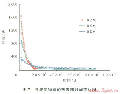 80m×400m×1m水合物藏開采模擬所得數(shù)據(jù),結(jié)合開采物藏和井的參數(shù),可計(jì)算減壓和加熱對水合物分解的貢獻(xiàn)。水合物藏中水合物總質(zhì)量為3.6×106kg。由式(2)可得,完全通過加熱熔化需要能量1.27×1012J。圖7為井流向物藏的熱流隨時間變化圖。對圖7熱流進(jìn)行積分,得到輸入物藏累計(jì)能量變化曲線(8)。在0.2P0、42℃條件下,輸人物藏的能量最大,為6.71×1010J。井內(nèi)溫壓條件為0.5P042℃時,輸入物藏的能量為5.39×1010J,0.8P0、42℃時,輸人物藏能量為4.39×1010J。由式(1)可得,在0.2P、42℃條件下,加熱分解了5.28%的水合物,其余的水合物由減壓驅(qū)動力所分解。而在另外兩種井內(nèi)溫度壓力條件下,加熱分解的水合物量多一些,而減壓所分解的水合物量相比更少一些。