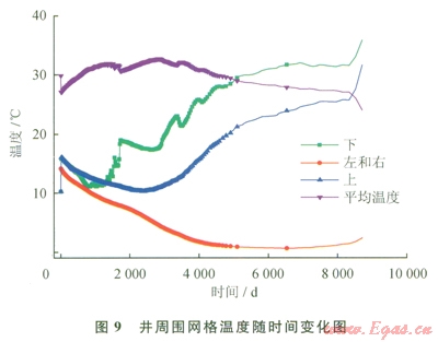 流入井內(nèi)的熱流可以通過手動計(jì)算得到印證。下面只對0.2P0、42℃條件下數(shù)據(jù)進(jìn)行計(jì)算。圖90.2P042℃條件下,井周圍網(wǎng)格溫度隨時間變化圖。井網(wǎng)格和其相連4個網(wǎng)格間溫度差及其平均值都列于圖9中,井溫度為定值42℃,平均溫差由如下式定義: