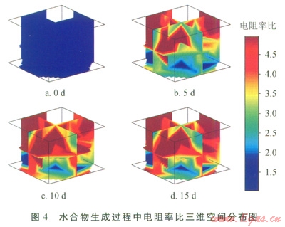 對比圖4a與圖4b發(fā)現(xiàn)電阻率變化量較大,而對比圖4c與圖4d發(fā)現(xiàn)電阻率變化較小。但是圖3中的壓力在整個水合物生成過程中是均勻下降的,表明水合物生成速率較穩(wěn)定,并沒有明顯的減慢趨勢。所以可以認為,電阻率與水合物飽和度并不是呈完全的線性關(guān)系。當水合物的飽和度升高到一定程度時,電阻率變化減緩。這是由于當多孔介質(zhì)中生成一定飽和度的水合物時,水合物會將多孔介質(zhì)中的通道阻塞,引起電阻率迅速上升;但當飽和度繼續(xù)上升時,電阻率則變化不大。