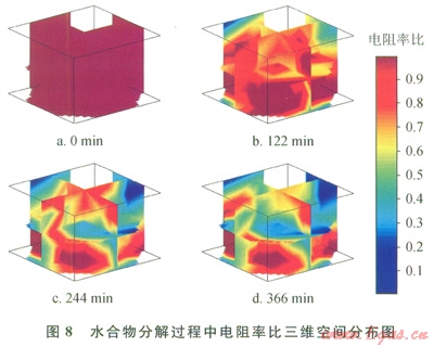 圖8是水合物分解過程中電阻率比三維空間分布圖。如圖8所示,圖8-a為開采前的水合物電阻率比三維分布圖,此時所有測點的電阻率比均為初始值l。圖8-b為開采第l22分鐘的電阻率比三維分布圖,此時水合物開采處于降壓開采階段,可以看見水合物藏內(nèi)的水合物開始分解,并且分解主要集中于上層,這可能是由于開采井位于上層的原因。而圖8-c和圖8-d分別為第244分鐘和第366分鐘的電阻率比云圖,可發(fā)現(xiàn)水合物藏中的電阻率比持續(xù)下降,表明水合物持續(xù)分解。并且在第366分鐘(圖8-d)達到最低。
