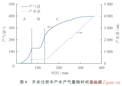 圖6為開采過程中產(chǎn)水、產(chǎn)氣量隨時間變化圖。如圖6所示,水合物開采過程一共歷時366min。3個開采階段的特性分別如下:自由氣釋放階段A中,逐漸產(chǎn)氣約ll5L,并在產(chǎn)氣即將結(jié)束的時候開始產(chǎn)水,共產(chǎn)水約400mL,此階段中的產(chǎn)氣和產(chǎn)水都是原先貯存于水合物藏中的自由氣和自由水;降壓開采階段B中,首先靜置了約30min后,再進行降壓分解實驗,在降壓過程中共產(chǎn)氣約120L,但是沒有更多的水產(chǎn)出;注熱開采階段C中,共產(chǎn)氣約l50L,產(chǎn)氣速率隨著開采過程的進行而降低,最終降低至0。這是由于水合物藏中的水合物逐漸分解完,水合物分解量減小從而導致產(chǎn)氣速率降低。并且在整個水合物注熱開采過程中,產(chǎn)水速率基本保持不變(約為20mL/min),基本與注水速率保持一致。